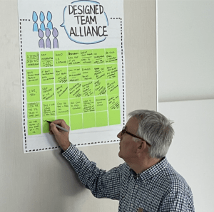 After setting the scene and getting the team connected to the day we facilitated the creation of their initial Designed Team Alliance (DTA) – laying out agreements they wanted to make to create the culture that would support their work. This is a living agreement for the team which they built on throughout the day as they gained new insights. The DTA is an artefact for the team to use well beyond the workshop that they can inspect and adapt on as their needs evolve.