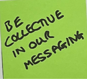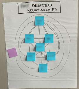 Then we explored their relationships, mapping the current state from their own perspective, sharing back gallery style for observation and noticing the patterns that emerged. With these insights they collectively aligned on their desired team relationships and then brainstormed actions to support this.