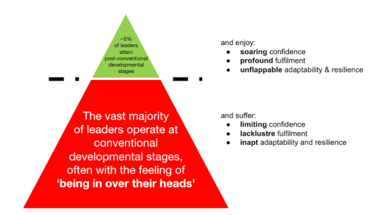 Research shows that the vast majority of leaders operate at conventional developmental stages. Many describe feeling in over their heads as complexity increases.